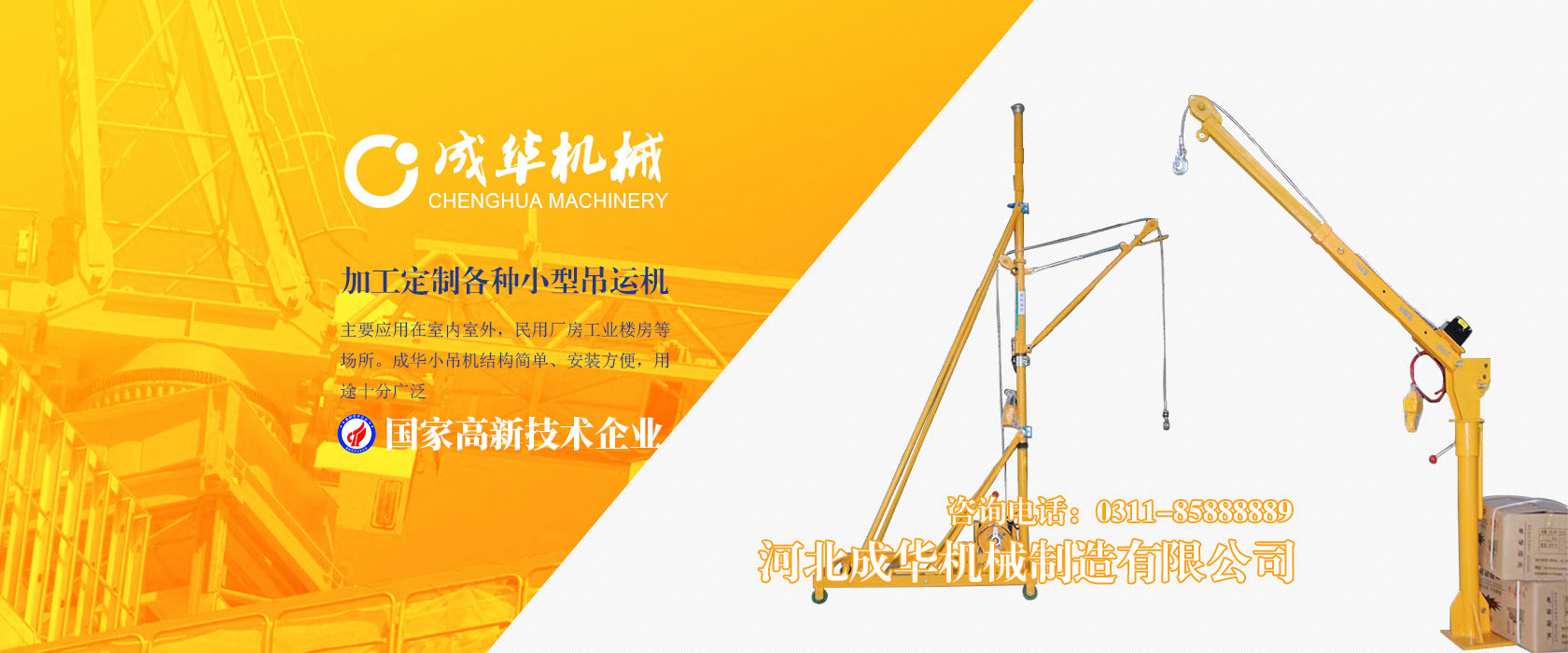 河北成華機械制造有限公司為國家高新技術(shù)企業(yè),旗下吊運機制造廠是家專業(yè)生產(chǎn)制造便攜式小吊機、手提式小吊機附屬工廠,我廠產(chǎn)品主要應(yīng)用在室內(nèi)室外,民用廠房工業(yè)樓房等場所。成華小吊機結(jié)構(gòu)簡單、安裝方便,用途十分廣泛,小吊機產(chǎn)品被廣泛應(yīng)用于機械制造、電子、汽車...
